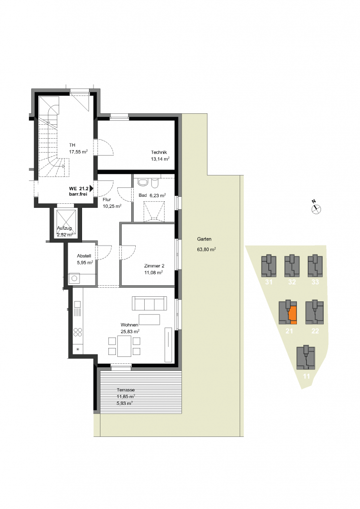 Diese barrierefreie Neubauwohnung in Zeuthen bietet auf ca. 65,26 m² im Erdgeschoss zwei gut geschnittene Zimmer mit Terrasse. Das Herzstück der Wohnung ist die Wohn-Küchen-Lounge mit großer Fensterfront und direktem Zugang zum persönlichen Outdoor-Paradies: Süd-Ost-Terrasse und einen Privat-Garten von ca. 63,80 m² – ideal für Morgen-Yoga oder den Sundowner. Das Badezimmer mit großer Dusche besticht durch hochwertige Vigour-Materialien und zeitloses Design. Ein praktischer Abstellraum mit Waschmaschinenanschluss bietet Stauraum. Ausstattung: Parkett, Fußbodenheizung und 3-fach verglaste Fenster mit elektrischen Rollläden. Energieeffizienzklasse A+ mit Photovoltaik senkt die Nebenkosten. Parkplatz: Stellplatz 12.500€ oder Carport 20.000€. Außenbereich: teilweise überdachte Fahrradständer, Abstellboxen für Kinderwagen/Rollstühle sowie ein Kinderspielplatz.