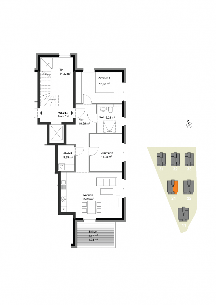 Diese großzügige Neubauwohnung in Zeuthen bietet auf ca. 77,35 m² im 1.OG drei gut geschnittene Zimmer mit Balkon. Das Herzstück der Wohnung ist die Wohn-Küchen-Lounge mit großer Fensterfront und direktem Zugang zum Süd-Ost-Balkon – ideal für Morgen-Yoga oder den Sundowner. Zwei wohlproportionierte Schlafzimmer bieten Platz für die Familie, lassen sich aber ebenso ideal als Homeoffice oder Gästebereich nutzen. Das Badezimmer mit großer Dusche besticht durch hochwertige Vigour-Materialien und zeitloses Design. Ein praktischer Abstellraum mit Waschmaschinenanschluss bietet Stauraum. Ausstattung: Parkett, Fußbodenheizung und 3-fach verglaste Fenster mit elektrischen Rollläden. Energieeffizienzklasse A+ mit Photovoltaik senkt die Nebenkosten. Parkplatz: Stellplatz 12.500€ oder Carport 20.000€. Außenbereich: teilweise überdachte Fahrradständer, Abstellboxen für Kinderwagen/Rollstühle sowie ein Kinderspielplatz.