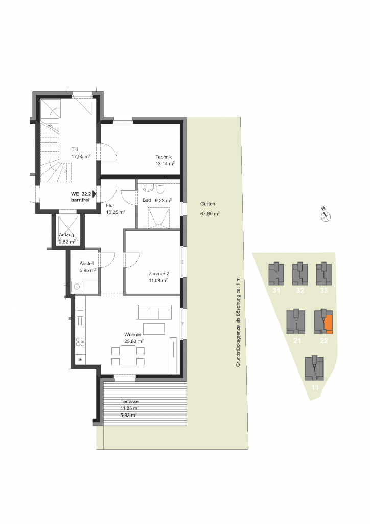 Diese barrierefreie Neubauwohnung in Zeuthen bietet auf ca. 65,26 m² im Erdgeschoss zwei gut geschnittene Zimmer mit Terrasse. Das Herzstück der Wohnung ist die Wohn-Küchen-Lounge mit großer Fensterfront und direktem Zugang zum persönlichen Outdoor-Paradies: Süd-Ost-Terrasse und einen Privat-Garten von ca. 67,80 m² – ideal für Morgen-Yoga oder den Sundowner. Das Badezimmer mit großer Dusche besticht durch hochwertige Vigour-Materialien und zeitloses Design. Ein praktischer Abstellraum mit Waschmaschinenanschluss bietet Stauraum. Ausstattung: Parkett, Fußbodenheizung und 3-fach verglaste Fenster mit elektrischen Rollläden. Energieeffizienzklasse A+ mit Photovoltaik senkt die Nebenkosten. Parkplatz: Stellplatz 12.500€ oder Carport 20.000€. Außenbereich: teilweise überdachte Fahrradständer, Abstellboxen für Kinderwagen/Rollstühle sowie ein Kinderspielplatz.