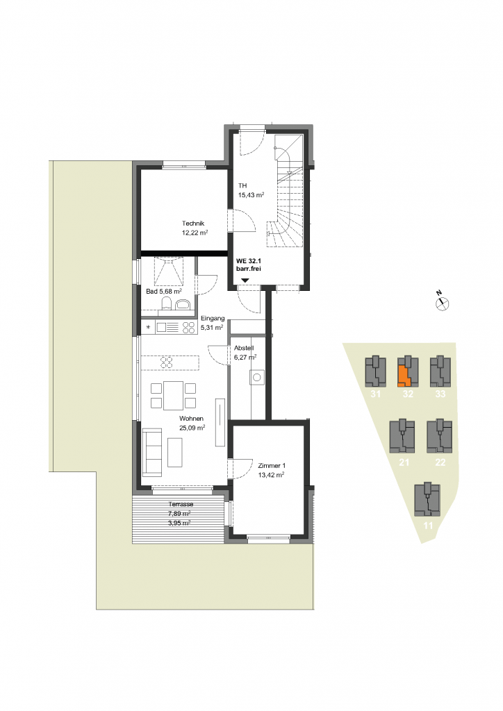 Diese barrierefreie Neubauwohnung in Zeuthen bietet auf ca. 59,72 m² im Erdgeschoss zwei gut geschnittene Zimmer mit Terrasse. Das Herzstück der Wohnung ist die Wohn-Küchen-Lounge mit großer Fensterfront und direktem Zugang zum persönlichen Outdoor-Paradies: Süd-West-Terrasse und einen Privat-Garten von ca. 72,40 m² – ideal für Morgen-Yoga oder den Sundowner. Das Badezimmer mit großer Dusche besticht durch hochwertige Vigour-Materialien und zeitloses Design. Ein praktischer Abstellraum mit Waschmaschinenanschluss bietet Stauraum. Ausstattung: Parkett, Fußbodenheizung und 3-fach verglaste Fenster mit elektrischen Rollläden. Energieeffizienzklasse A+ mit Photovoltaik senkt die Nebenkosten. Parkplatz: Stellplatz 12.500€ oder Carport 20.000€. Außenbereich: teilweise überdachte Fahrradständer, Abstellboxen für Kinderwagen/Rollstühle sowie ein Kinderspielplatz.