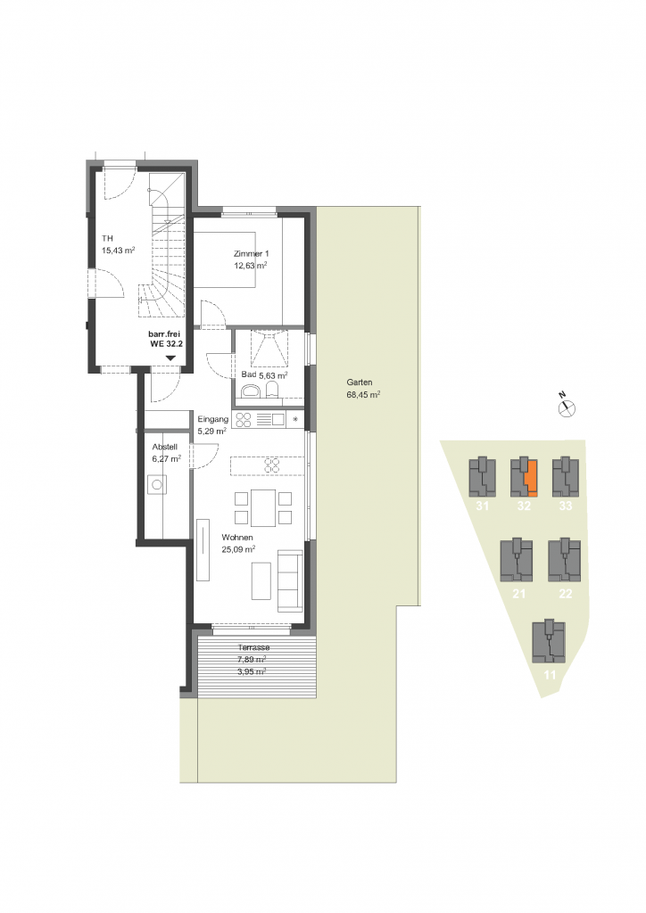 Diese barrierefreie Neubauwohnung in Zeuthen bietet auf ca. 58,87 m² im Erdgeschoss zwei gut geschnittene Zimmer mit Terrasse. Das Herzstück der Wohnung ist die Wohn-Küchen-Lounge mit großer Fensterfront und direktem Zugang zum persönlichen Outdoor-Paradies: Süd-Ost-Terrasse und einen Privat-Garten von ca. 68,45 m² – ideal für Morgen-Yoga oder den Sundowner. Das Badezimmer mit großer Dusche besticht durch hochwertige Vigour-Materialien und zeitloses Design. Ein praktischer Abstellraum mit Waschmaschinenanschluss bietet Stauraum. Ausstattung: Parkett, Fußbodenheizung und 3-fach verglaste Fenster mit elektrischen Rollläden. Energieeffizienzklasse A+ mit Photovoltaik senkt die Nebenkosten. Parkplatz: Stellplatz 12.500€ oder Carport 20.000€. Außenbereich: teilweise überdachte Fahrradständer, Abstellboxen für Kinderwagen/Rollstühle sowie ein Kinderspielplatz.