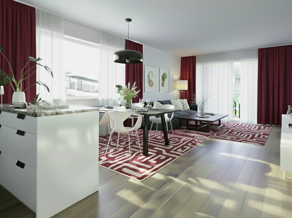 Diese großzügige Neubauwohnung in Zeuthen bietet auf ca. 100,72 m² im 2.OG vier gut geschnittene Zimmer, zwei Bäder und eine Terrasse. Das Herzstück der Wohnung ist die Wohn-Küchen-Lounge mit großer Fensterfront und direktem Zugang zum persönlichen Outdoor-Paradies: die Süd-West-Terrasse, ideal für Morgen-Yoga oder den Sundowner. Drei wohlproportionierte Schlafzimmer bieten Platz für die ganze Familie, lassen sich aber ebenso ideal als Homeoffice oder Gästebereich nutzen. Die Badezimmer, eines mit großer Dusche und das andere mit Badewanne, Überzeugen mit hochwertigen Vigour-Materialien und zeitlosem Design. Ein praktischer Abstellraum mit Waschmaschinenanschluss bietet Stauraum. Ausstattung: Parkett, Fußbodenheizung und 3-fach verglaste Fenster mit elektrischen Rollläden. Energieeffizienzklasse A+ mit Photovoltaik senkt die Nebenkosten. Parkplatz optional: Stellplatz 12.500€ oder Carport 20.000€. Außenbereich: teilweise überdachte Fahrradständer, Abstellboxen für Kinderwagen/Rollstühle sowie ein Kinderspielplatz.