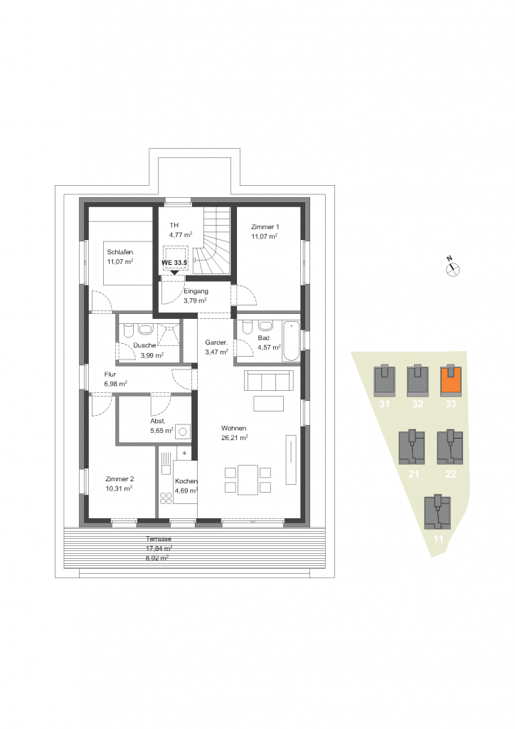 Diese großzügige Neubauwohnung in Zeuthen bietet auf ca. 100,72 m² im 2.OG vier gut geschnittene Zimmer, zwei Bäder und eine Terrasse. Das Herzstück der Wohnung ist die Wohn-Küchen-Lounge mit großer Fensterfront und direktem Zugang zum persönlichen Outdoor-Paradies: die Süd-West-Terrasse, ideal für Morgen-Yoga oder den Sundowner. Drei wohlproportionierte Schlafzimmer bieten Platz für die ganze Familie, lassen sich aber ebenso ideal als Homeoffice oder Gästebereich nutzen. Die Badezimmer, eines mit großer Dusche und das andere mit Badewanne, Überzeugen mit hochwertigen Vigour-Materialien und zeitlosem Design. Ein praktischer Abstellraum mit Waschmaschinenanschluss bietet Stauraum. Ausstattung: Parkett, Fußbodenheizung und 3-fach verglaste Fenster mit elektrischen Rollläden. Energieeffizienzklasse A+ mit Photovoltaik senkt die Nebenkosten. Parkplatz optional: Stellplatz 12.500€ oder Carport 20.000€. Außenbereich: teilweise überdachte Fahrradständer, Abstellboxen für Kinderwagen/Rollstühle sowie ein Kinderspielplatz.