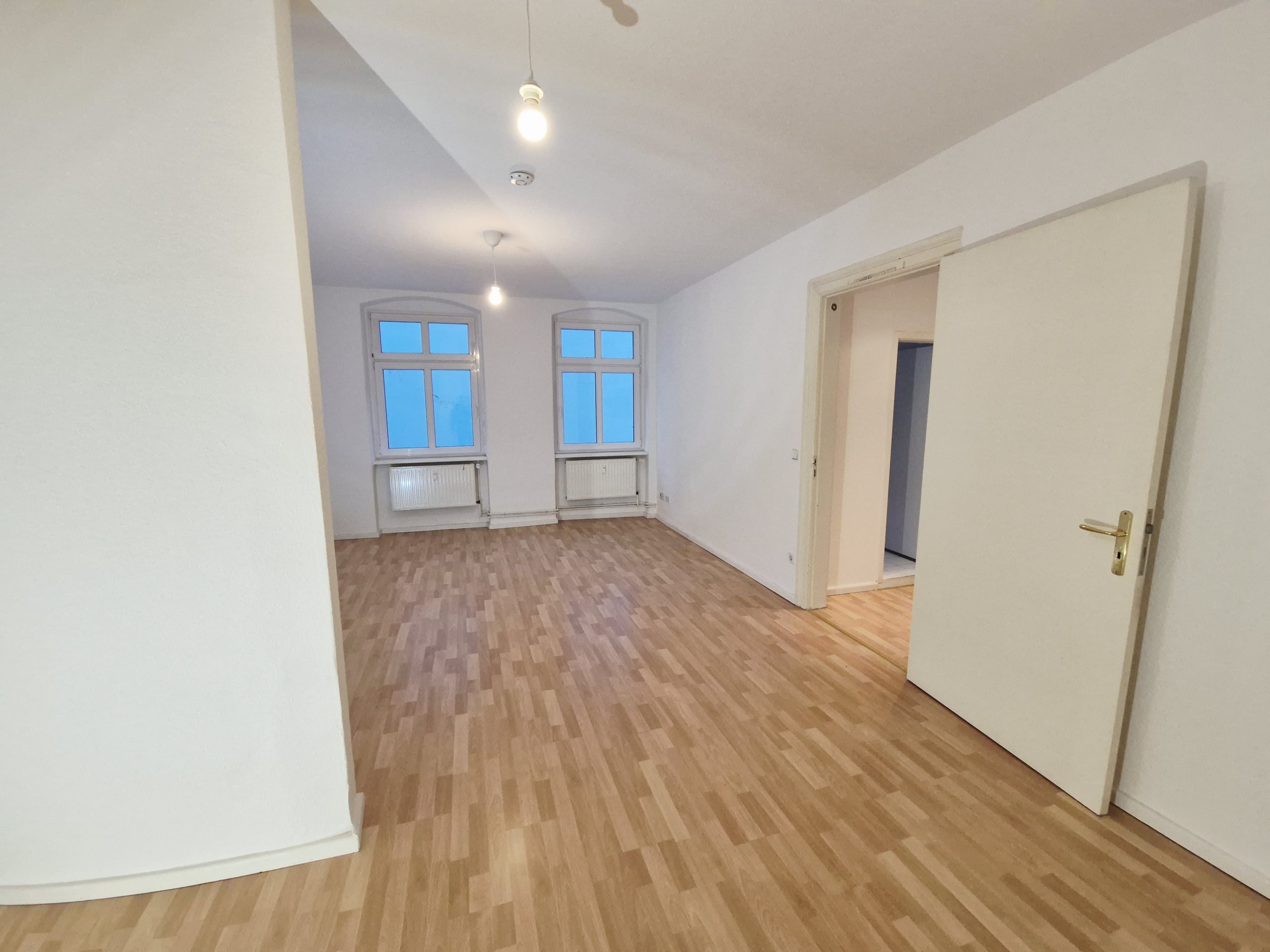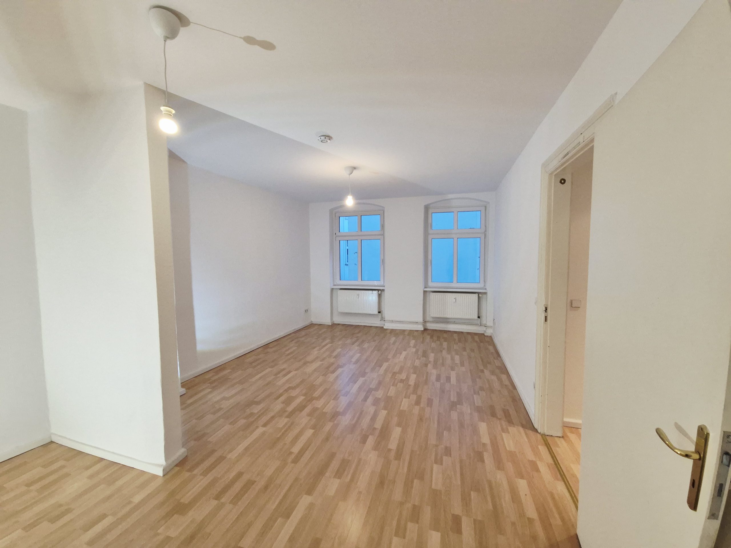 Das gut 27 m² große Zimmer ist der zentrale Raum der Wohnung und bietet einen offenen Wohn- und Essbereich, der durch zwei große Fenster viel Tageslicht hereinlässt, und einen optisch abgetrennten Schlafbereich.