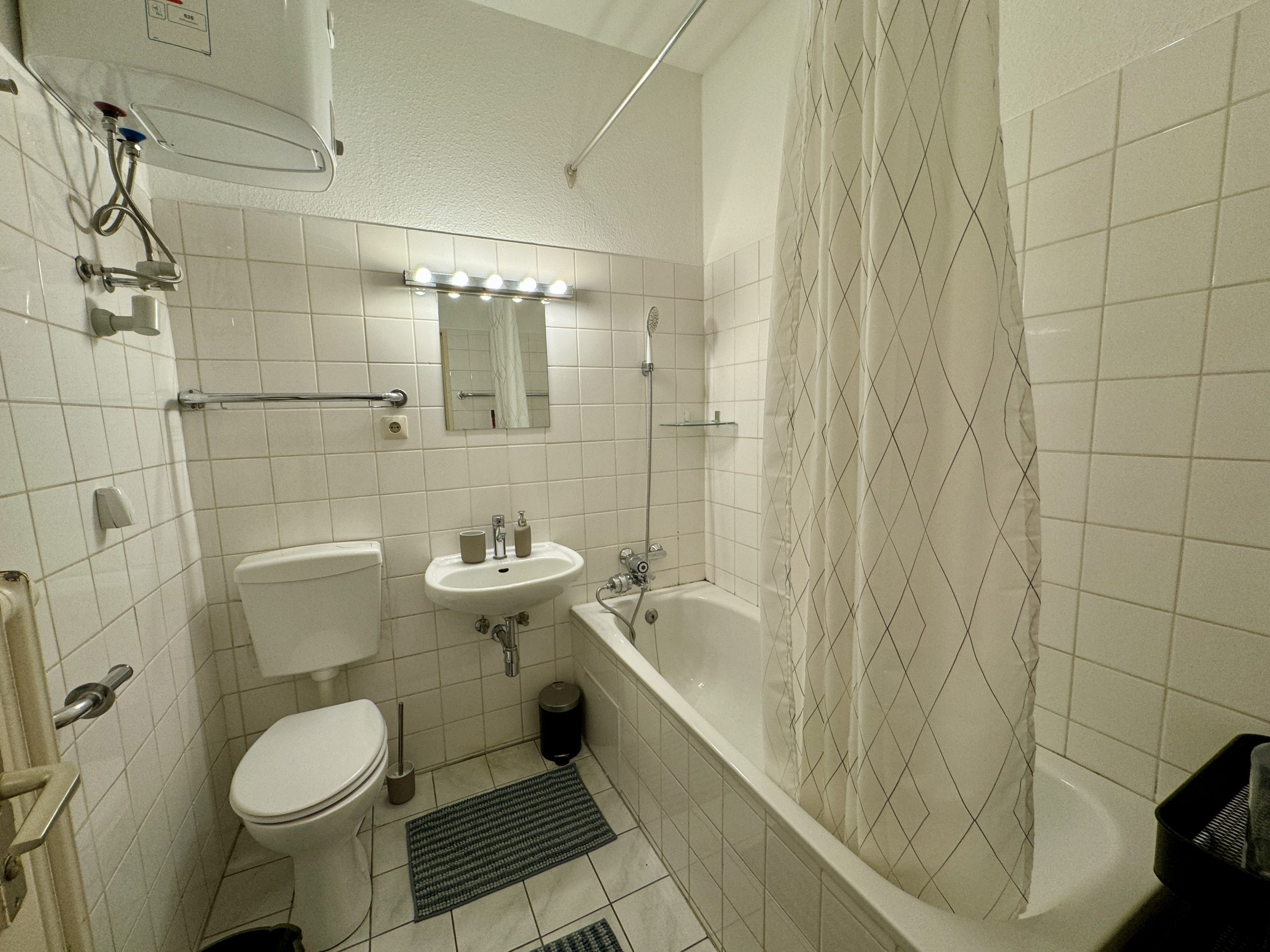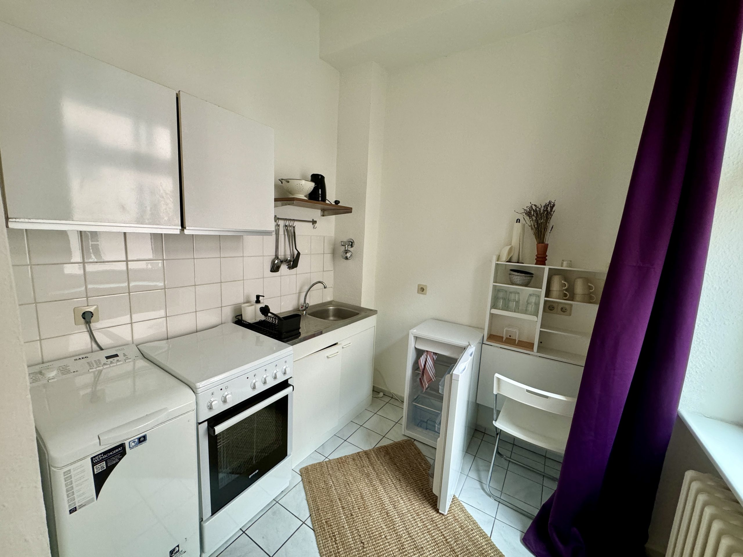 Der ca. 21 m² große Wohn- und Schlafbereich mit hohen Decken und zwei großen Süd-Fenstern ist hell und freundlich. Die Küche, ebenfalls lichtdurchflutet, bietet Platz für einen kleinen Essbereich mit Blick auf den ruhigen Hof. Das weiß geflieste Badezimmer mit Badewanne rundet das Angebot ab.