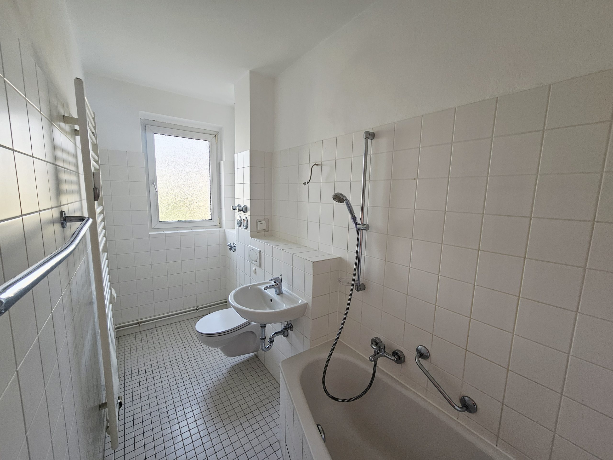 Das ebenfalls helle und geflieste Bad ist zeitgemäß gestaltet und verfügt über eine Badewanne, ein Fenster und einen Waschmaschinenstellplatz.